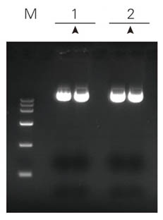 注解:PUC19質(zhì)粒 菌液OD600=1.530 1:ZP101 2:ZPK101 M:莊盟DNA MarkerⅥ Marker與樣品均為5μl點(diǎn)樣 | 注解:PET-15B質(zhì)粒(中低拷貝) 菌液OD600=1.824 1:ZP101 2:ZPK101 M:莊盟DNA MarkerⅥ Marker與樣品均為5μl點(diǎn)樣 | 注解:8K質(zhì)粒 菌液OD600=1.167 1:ZP101 2:ZPK101 M:莊盟DNA MarkerⅥ Marker與樣品均為5μl點(diǎn)樣 | 注解:15K質(zhì)粒 菌液OD600=1.553 1:ZP101 2:ZPK101 M:莊盟DNA MarkerⅥ Marker為5μl樣品為2μl點(diǎn)樣 |