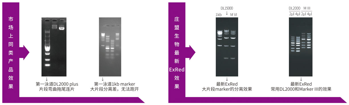 ★ 完全改善大片段的分離效果,極難分離的1kb marker ,40min即可跑開,且條帶清晰。