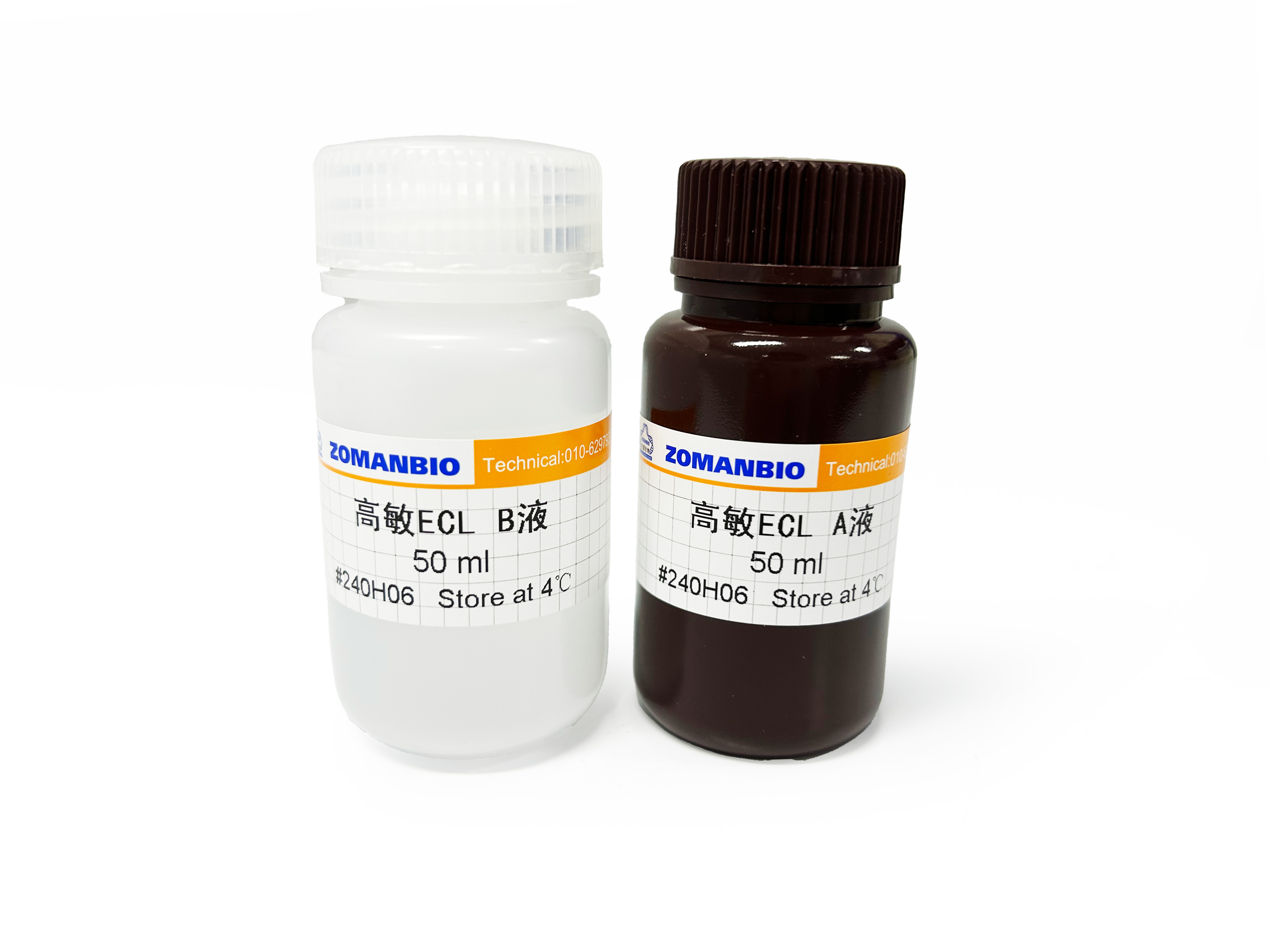 ECL(enhanced chemiluminescence)發(fā)光液是基于魯米諾(Luminol)的新一代增強型化學(xué)發(fā)光底物試劑,即辣根過氧化物酶(HRP)化學(xué)發(fā)光底物液,是目前WB檢測中最常用高靈敏的顯色試劑。