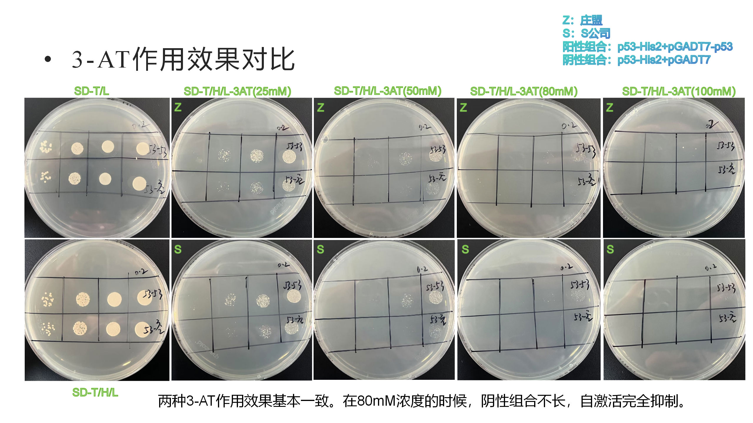 1.理想情況10 mM濃度的3-AT平板會(huì)有少量生長,20 mM濃度的3-AT不能或極少生長。如果在80 mM濃度的3-AT平板上生長酵母,說明自激活活性太高,不能用于雙雜交篩選。