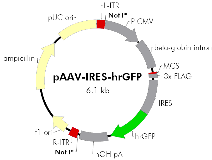 該質(zhì)粒pAAV-IRES-hrGFP載體含有在哺乳動(dòng)物細(xì)胞中基因的高水平表達(dá)的CMV啟動(dòng)子和其他元素時(shí)。該載體還包含構(gòu)建反向末端重復(fù)序列(ITRS),其中直接病毒復(fù)制和包裝。質(zhì)粒pAAV-IRES-hrGFP可容納插入≤1.7 KB。