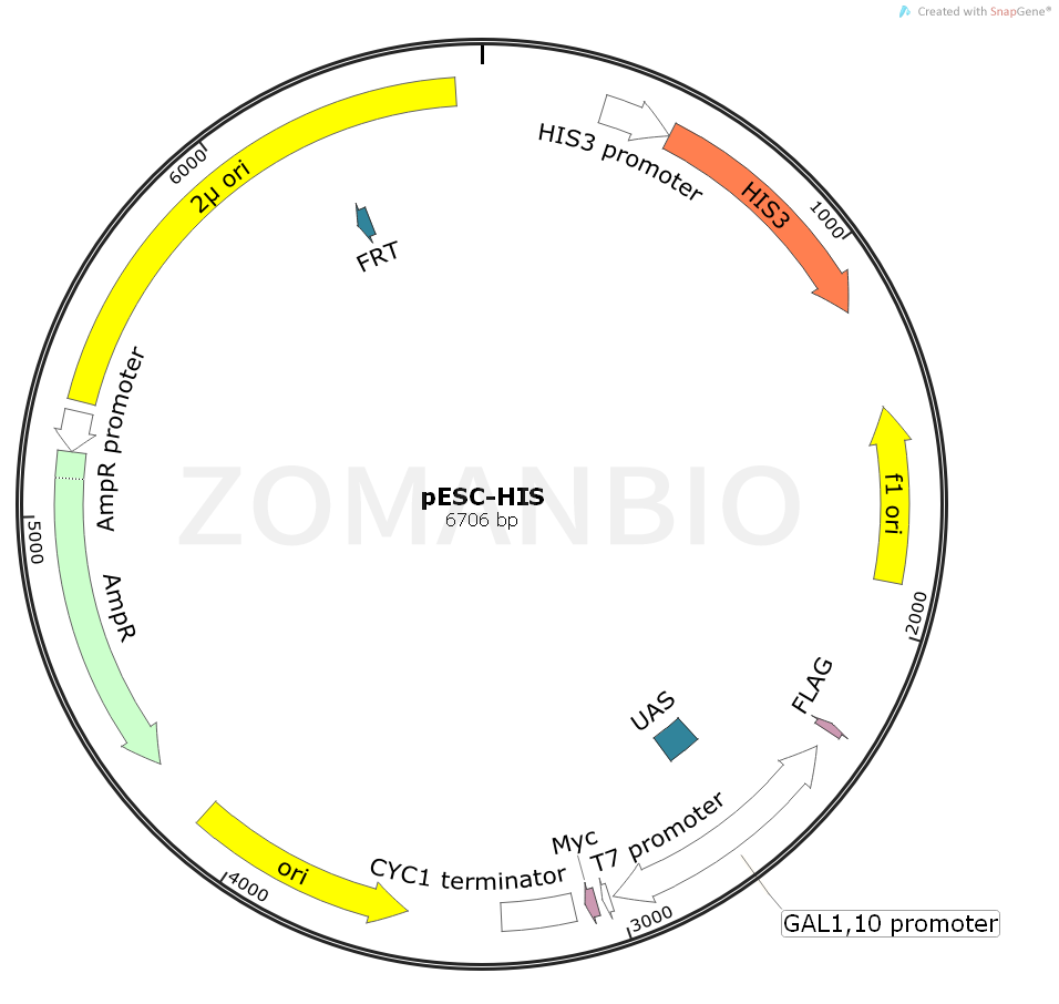 The pESC vectors are a series of epitope-tagging vectors for expression of eukaryotic genes in the yeast S. cerevisiae. Each vector contains GAL1 and GAL10 yeast promoters in opposing orientations. With these vectors you can introduce one or two cloned genes into a yeast host strain under the control of an inducible promoter. These vectors also feature an extensive polylinker sequence and the ability to generate end-specific RNA transcripts from T3 and T7 promoters. Each of the pESC vectors contains one of four different yeast-selectable markers (HIS3, TRP1, LEU2, or URA3) in the same vector backbone.