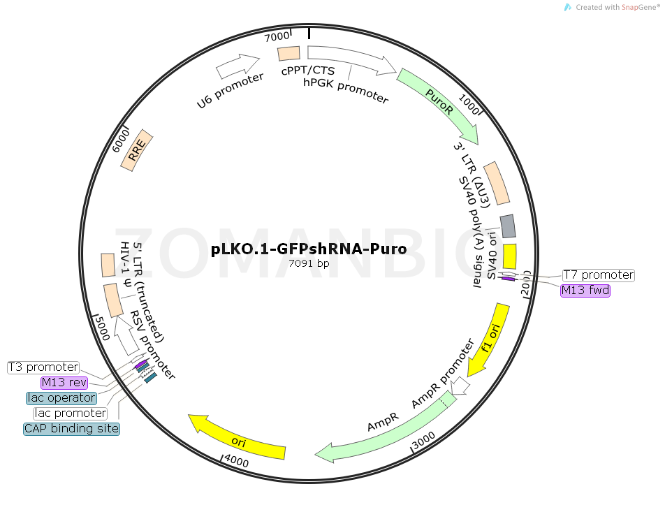 pLKO.1-GFPshRNA質(zhì)粒是在pLKO.1-Puro載體上克隆了一段GFPshRNA序列得到的一個(gè)哺乳細(xì)胞慢病毒RNA干擾質(zhì)粒。U6啟動(dòng)GFPshRNA的轉(zhuǎn)錄,可特異性的干擾GFP蛋白的表達(dá)。該質(zhì)??勺鳛槠胀ㄟ^表達(dá)質(zhì)粒直接轉(zhuǎn)染哺乳細(xì)胞,也可包裝成慢病毒侵染細(xì)胞。質(zhì)粒本身帶有Puro篩選標(biāo)記,可用嘌呤霉素篩選轉(zhuǎn)染后的細(xì)胞得到陽性克隆。