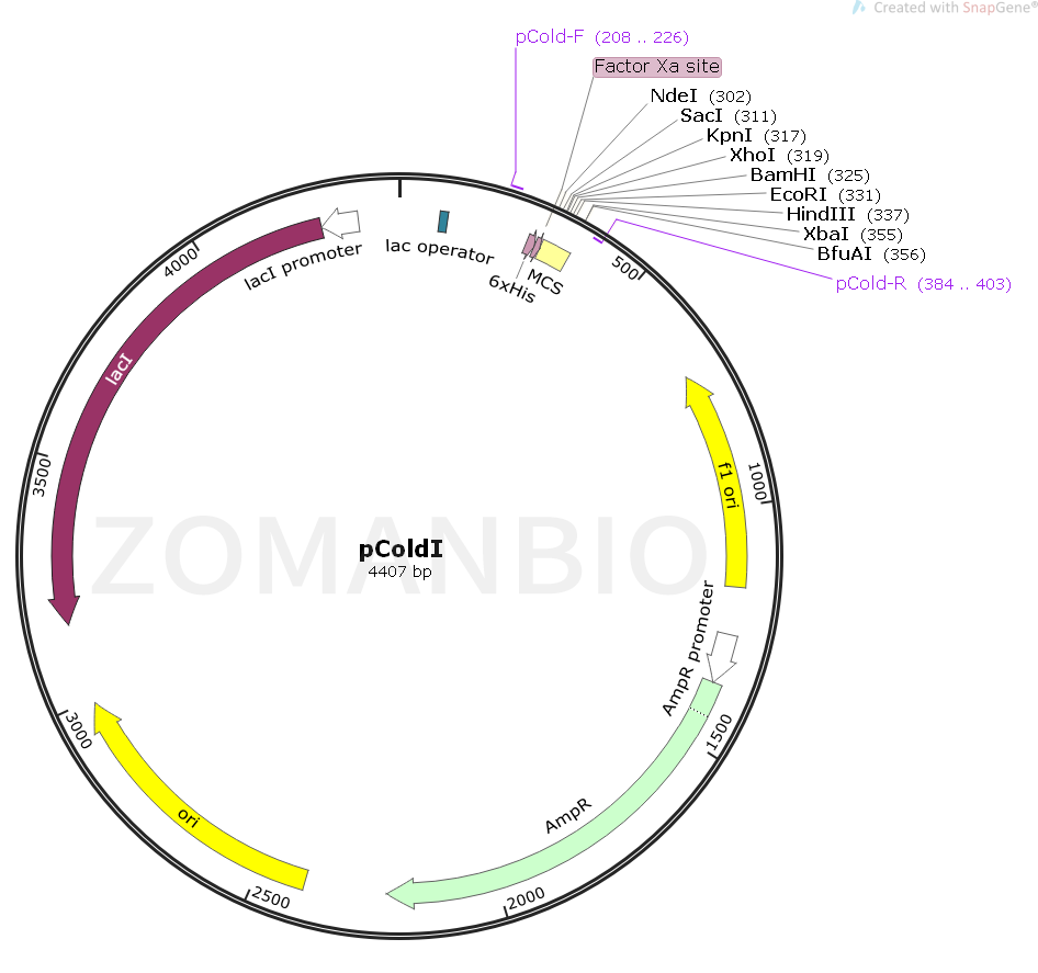 pColdI質(zhì)粒是利用冷休克基因CSPA啟動(dòng)子設(shè)計(jì)高效率蛋白質(zhì)表達(dá)載體。在啟動(dòng)子下游處,插入了lac操縱子,以便嚴(yán)格控制表達(dá)。此外,5’非翻譯區(qū)(5’UTR),翻譯增強(qiáng)元件(TEE),His標(biāo)簽序列,Xa因子切割位點(diǎn)和多克隆位點(diǎn)(MCS)位于CAPS啟動(dòng)子的下游。當(dāng)培養(yǎng)溫度切換到低溫時(shí),大腸桿菌暫時(shí)停止生長,大部分的大腸桿菌蛋白質(zhì)表達(dá)減少,但是一類稱為冷休克蛋白的蛋白質(zhì)被特異性誘導(dǎo)表達(dá)。