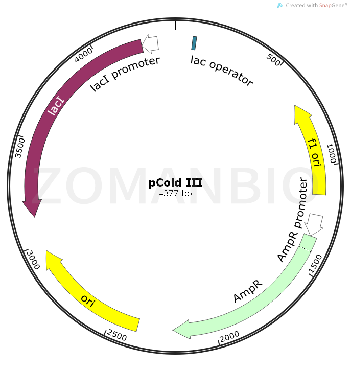 pCold III質(zhì)粒是利用冷休克基因CspA啟動(dòng)子設(shè)計(jì)高效率蛋白質(zhì)表達(dá)載體。在啟動(dòng)子下游處,插入了lac操縱子,以便嚴(yán)格控制表達(dá)。此外,5’非翻譯區(qū)(5’UTR),翻譯增強(qiáng)元件(TEE),His標(biāo)簽序列,Xa因子切割位點(diǎn)和多克隆位點(diǎn)(MCS)位于CAPS啟動(dòng)子的下游。當(dāng)培養(yǎng)溫度切換到低溫時(shí),大腸桿菌暫時(shí)停止生長(zhǎng),大部分的大腸桿菌蛋白質(zhì)表達(dá)減少,但是一類(lèi)稱(chēng)為冷休克蛋白的蛋白質(zhì)被特異性誘導(dǎo)表達(dá)。