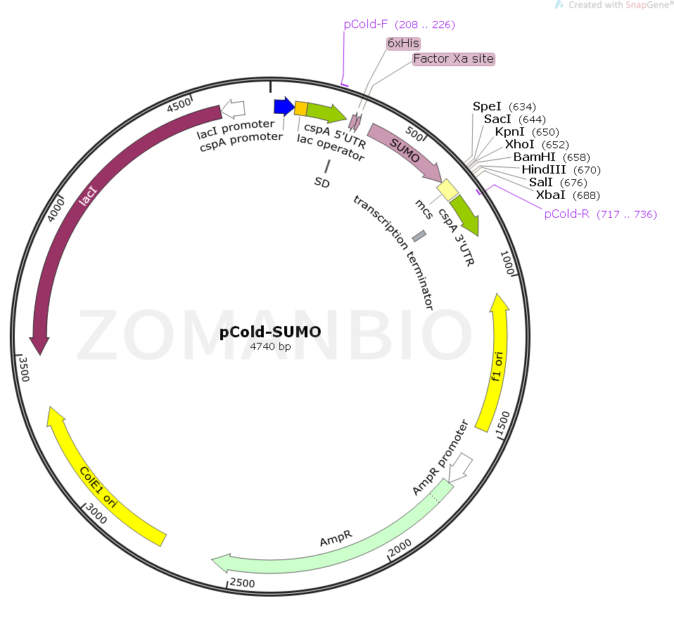 pCold-SUMO質(zhì)粒是利用冷休克基因CSPA啟動(dòng)子設(shè)計(jì)高效率蛋白質(zhì)表達(dá)載體。在E.COLI啟動(dòng)子下游處,插入了lac操縱子,以便嚴(yán)格控制表達(dá)。此外,5’非翻譯區(qū)(5’UTR),翻譯增強(qiáng)元件(TEE),His標(biāo)簽序列,Xa因子切割位點(diǎn)和多克隆位點(diǎn)(MCS)位于CAPS啟動(dòng)子的下游。當(dāng)培養(yǎng)溫度切換到低溫時(shí),大腸桿菌暫時(shí)停止生長(zhǎng),大部分的大腸桿菌蛋白質(zhì)表達(dá)減少,但是一類稱為冷休克蛋白的蛋白質(zhì)被特異性誘導(dǎo)表達(dá)。
