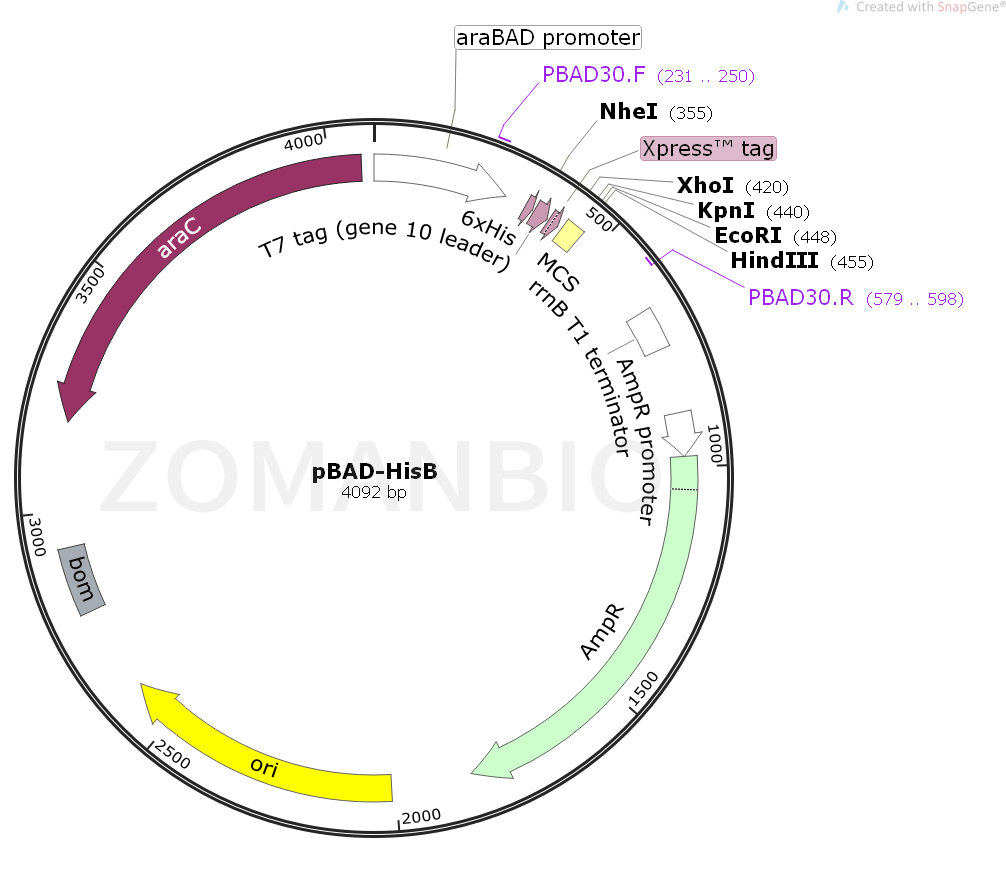 pBAD-HisB質(zhì)粒是衍生于pBR322載體。載體設(shè)計(jì)用來(lái)在大腸桿菌中進(jìn)行可調(diào)節(jié),劑量依賴性的表達(dá)和純化重組目的蛋白。使大腸桿菌araBAD啟動(dòng)子(pBAD)增強(qiáng)了大腸桿菌重組蛋白可溶性表達(dá)的水平。pBAD/His和pBAD/Myc His載體上的調(diào)節(jié)蛋白AraC能夠調(diào)控pBad啟動(dòng)子。pBAD/Myc-His B 載體是阿拉伯糖調(diào)控載體,在無(wú)葡萄糖的培養(yǎng)基中,阿拉伯糖正向調(diào)控目的基因的表達(dá),通過(guò)調(diào)節(jié)阿拉伯糖的濃度水平來(lái)優(yōu)化目的蛋白的可溶性表達(dá)。
