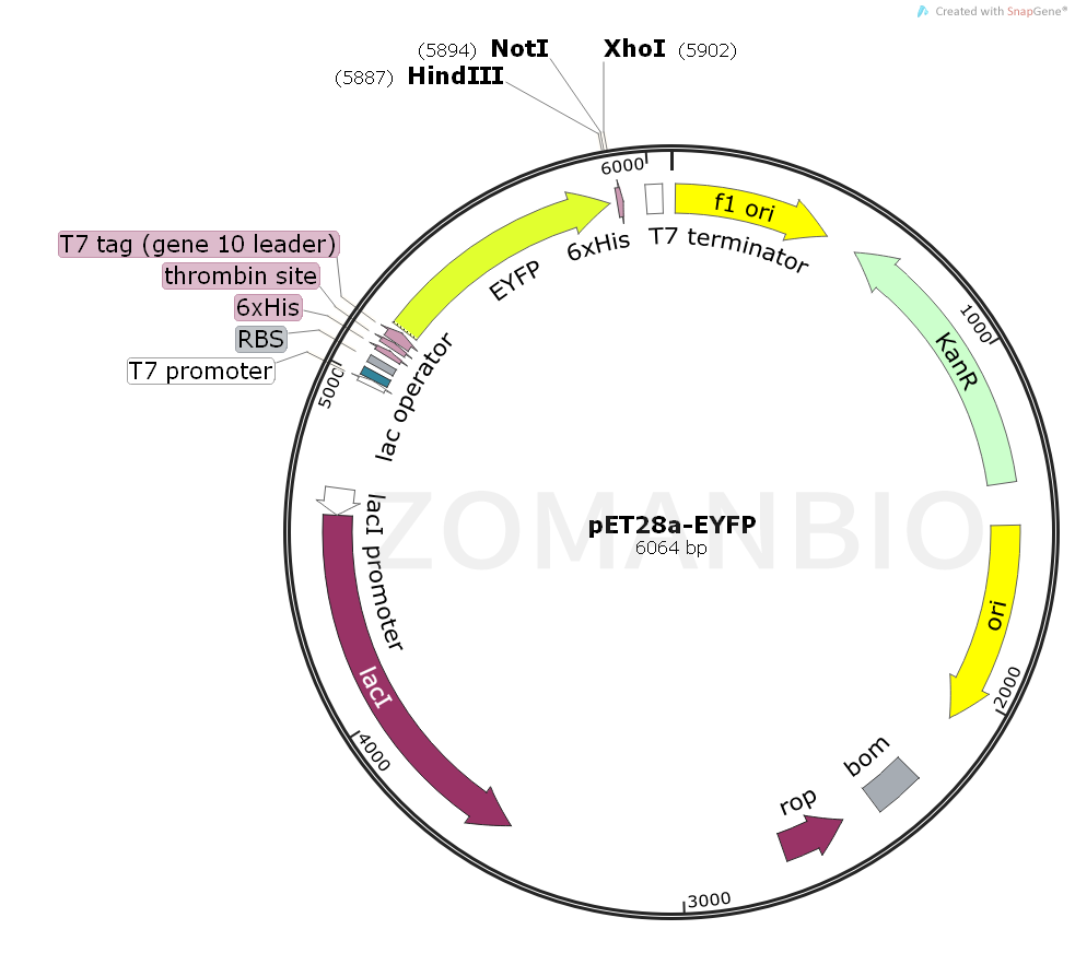 pET28a-EYFP質(zhì)粒是一種原核表達(dá)載體,C端含有一個(gè)6×His標(biāo)簽,N端含有一個(gè)thrombin位點(diǎn)、6×His標(biāo)簽、T7標(biāo)簽和EYFP標(biāo)簽。該質(zhì)粒含有多個(gè)常用的酶切位點(diǎn),便于不同基因克隆。表達(dá)由宿主細(xì)胞提供的T7 RNA聚合酶誘導(dǎo),目的基因被克隆到質(zhì)粒載體上,受噬菌體強(qiáng)轉(zhuǎn)錄及翻譯信號控制。