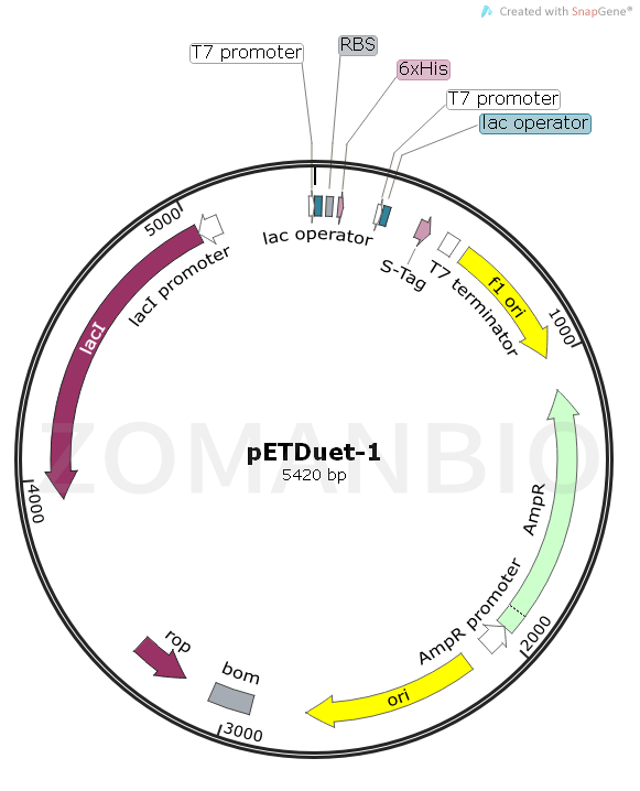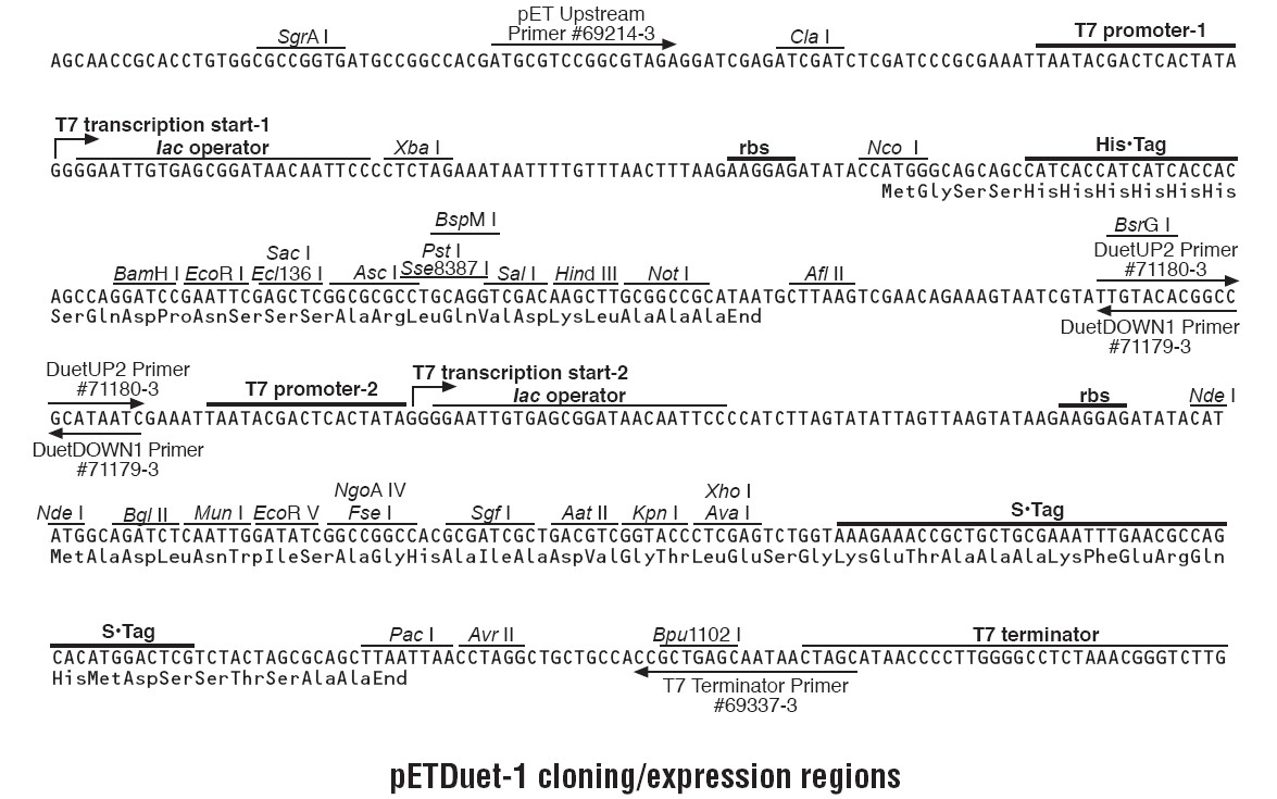 pETDuet-1載體被設(shè)計(jì)用來(lái)在大腸桿菌中同時(shí)表達(dá)兩個(gè)外源基因. 載體含有兩個(gè)多克隆位點(diǎn),每一個(gè)多克隆位點(diǎn)是通過(guò)T7啟動(dòng)子/Lac操縱子和一個(gè)核糖體結(jié)合位點(diǎn)組成。pETDuet-1攜帶有pBR322質(zhì)粒來(lái)源的ColE1復(fù)制子, lacI基因和氨芐抗性基因。本載體可以與pACYCDuet-1載體聯(lián)合使用,在合適的宿主菌中,可以一起共表達(dá)至多4個(gè)目的基因。插入在pETDuet-1載體多克隆位點(diǎn)1的目的基因可以使用pET Upstream 引物和DuetDOWN1 引物進(jìn)行測(cè)序,插入在多克隆位點(diǎn)2的目的基因可以通過(guò)DuetUP2 引物 和T7 Terminator 引物進(jìn)行目的基因測(cè)序。