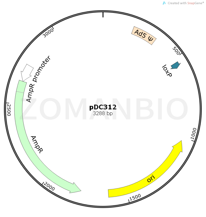 pDC312質(zhì)粒是一個(gè)腺病毒表達(dá)載體,MCS處前后無(wú)CMV啟動(dòng)子和poly A終止子,方便插入完整表達(dá)盒。