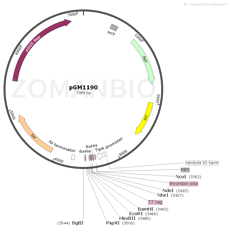pGM1190是一個鏈霉菌表達(dá)載體,通過TipA 啟動子驅(qū)動目的基因的表達(dá)。轉(zhuǎn)化進(jìn)鏈霉素的時候請用35℃的溫度培養(yǎng)。OriT containing mobilizable vector for thiostrepton induced gene expression in Streptomyces,replicates also in Streptomyces (below 35°C).