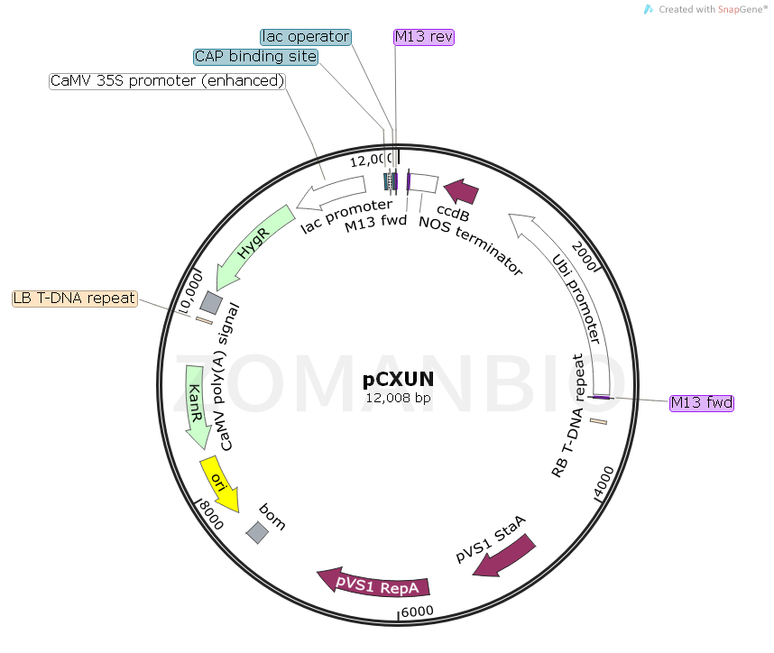 pCXUN質粒是一個植物過表達載體,Ubi啟動子驅動目的基因的表達。使用XcmI酶切空載體得到T載體,可連入兩端帶A的PCR產(chǎn)物,并在ccdb致死基因的幫助下,基因克隆的陽性率得以大大提高。