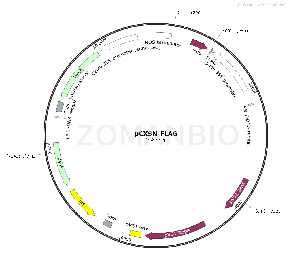 pCXSN-FLAG質(zhì)粒是一個(gè)植物過表達(dá)質(zhì)粒,35S啟動(dòng)子驅(qū)動(dòng)FLAG標(biāo)簽和目的基因融合表達(dá),在ccdb致死基因的作用下,克隆基因變得更加容易,陽性率高。