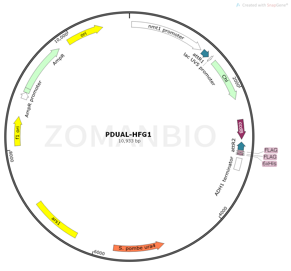 pDUAL-HFG1釀酒酵母Gateway系統(tǒng)表達(dá)質(zhì)粒,采用維生素B1抑制啟動(dòng)子nmt啟動(dòng)子。