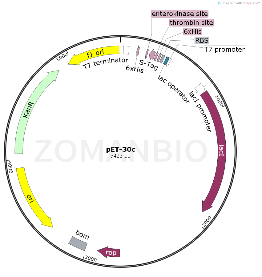 The pET-30a-c(+) vectors carry an N-terminal His? Tag?/ thrombin/ S? Tag?/ enterokinase configuration plus an optional C-terminal His? Tag sequence. Unique sites are shown on the circle map. Note that the sequence is numbered by the pBR322 convention, so the T7 expression region is reversed on the circular map. The cloning/expression region of the coding strand transcribed by T7 RNA polymerase is shown below. The f1 origin is oriented so that infection with helper phage will produce virions containing single-stranded DNA that corresponds to the coding strand. Therefore, single-stranded sequencing should be performed using the T7 terminator primer .